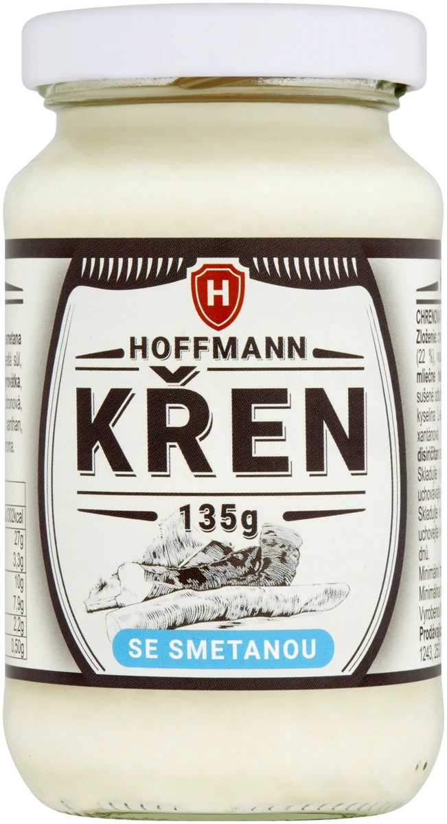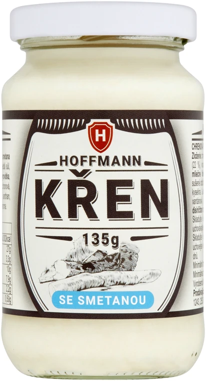 | Složení | Strouhaný křen (25 %),Řepkový olej,Smetana (22 %),Pitná voda,Ocet kvasný vinný,Cukr,Jedlá sůl,Mléčné bílkoviny,Modifikovaný škrob,Syrovátka,Sušené odstředěné mléko,Kyseliny: kyselina citronová, kyselina L-askorbová,Stabilizátory: guma guar, xanthan, karubin,Antioxidant: disiřičitan sodný,Přírodní aroma |