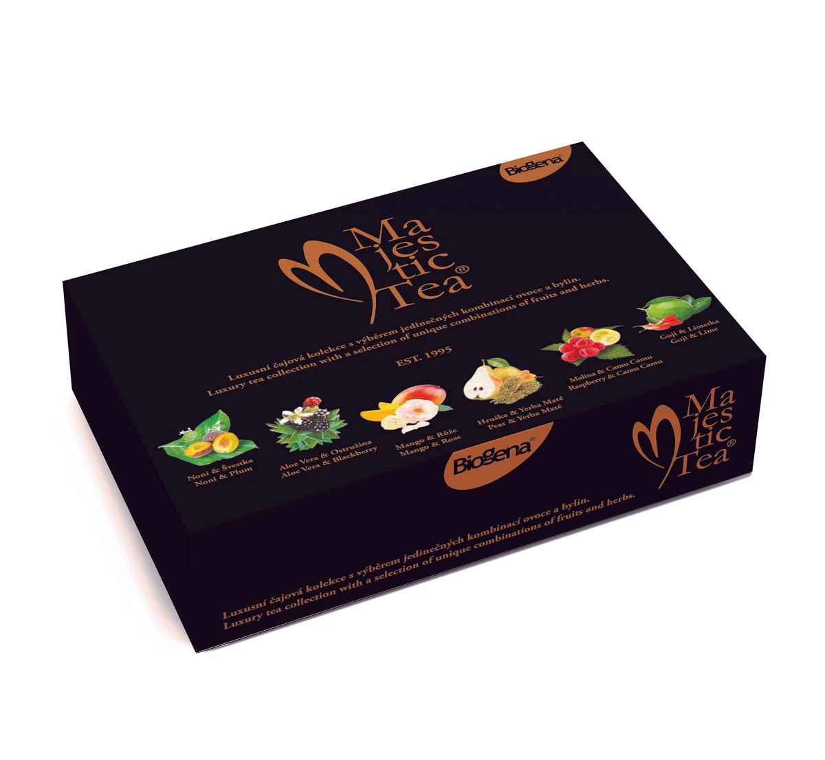 Noni & Švestka: Šípek plod, ibišek květ, borůvka plod, aronie plod, ostružiník list, aroma, skořice kůra, kyselina: kyselina vinná, noni plod - extrakt 0,1 %, švestka plod - extrakt 0,1 %. Aloe Vera & Ostružina: Ibišek květ, jablko plod, ostružiník list 13 %, aroma, šípek plod, aloe vera list 0,1 %, ostružina plod - extrakt 0,1 %. Mango & Růže: Šípek plod, ibišek bílý květ, ostružiník list, aroma, jablko plod, růže květ 5 %, citronová tráva, mangový prášek 1 % (mangová dužina, maltodextrin). Hruška & Yerba Maté: Jablko plod, šípek plod, aroma, yerba maté list 5 %, čekanka kořen, svatojánský chléb, ostružiník list, kyselina: kyselina citronová, hruška plod 2 %. Malina & Camu Camu: Ibišek květ, jablko plod, ostružiník list, aronie plod, aroma, skořice kůra, malina plod 2 %, Camu Camu extrakt 1 %, černý bez plod, pomeranč oplodí. Goji & Limetka: Jablko plod, ostružiník list, aroma, čekanka kořen, kyselina: kyselina citronová, ibišek květ, lékořice kořen, citronová tráva nať, šípek plod, citron oplodí, limetka oplodí 1,5 %, goji plod - koncentrát 1 %. |