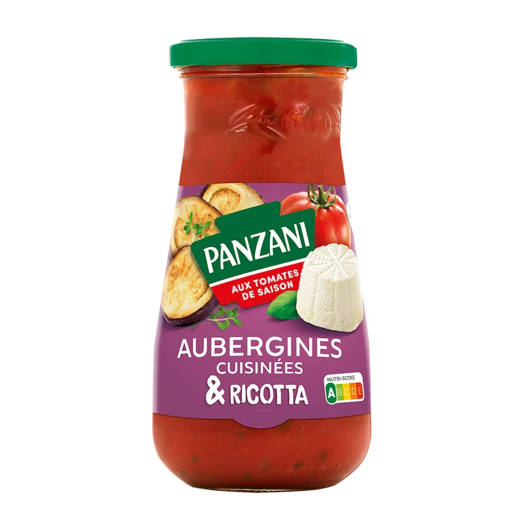 Kousky rajčatové dužiny a rajčatové pyré (64 %), voda, předsmažený a grilovaný lilek 7,7 %, RICOTTA SÝR (MLÉKO) 5 %, cibule, slunečnicový olej, cukr, česnek, sůl, modifikovaný kukuřičný škrob, citronová šťáva, aromatické byliny 0,2 %, petržel 0,1 %. |