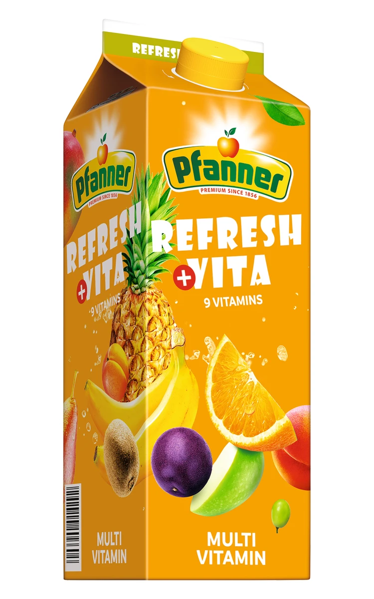 Pitná voda, ovocná šťáva z několika druhů ovoce vyrobená z koncentrátů ovocných šťáv (jablko, pomeranč, ananas, hroznové víno, maracuja, hruška, kiwi), cukr, směs ovocných dření zčásti z koncentrátu ovocných dření (broskev, meruňka, banán, kvajáva, mango), kyselina: kyselina citronová, stabilizátory: E440, E412, E410; aroma, vitaminy (C, niacin, E, kyselina pantothenová, B6, riboflavin, thiamin, biotin), beta-karoten. Podíl ovocné složky nejméně: 10%. |